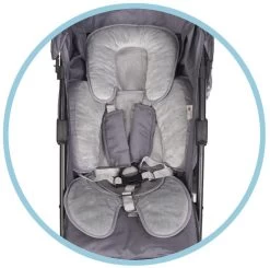 De hoofdsteun kan aangepast worden naarmate de baby groeit en de luchtdoorlatende stoffen bieden extra comfort en veiligheid in alle seizoenen. Het kussen heeft openingen voor veiligheidsgordels en het onderste deel is waterdicht voor bescherming bij luierongelukjes.