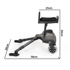 Het meerijdplankje is 58 x 36 x 56 cm groot en kan compact ingeklapt worden tot 60 x 17 x 32 cm. Hij is geschikt voor kindjes vanaf 15 maanden tot een maximumgewicht van 20kg. Wanneer je het plankje even niet gebruikt kun je hem makkelijk omhoog klappen, zo hoef je hem niet helemaal te demonteren.