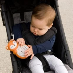 Het schattige diertje heeft een ingebouwd nachtlampje, deze bevindt zich in het hoofdje van de vos. Ook kan het schattige vosje 8 verschillende geluiden en melodieën maken. Ook is het mogelijk om het volume hoger of lager te zetten met de knopjes die op de vos zitten. Door de rustgevende geluiden kan je kindje overal kalm in slaap vallen. Na 45 minuten schakelt het geluid zich automatisch uit en na 15 minuten schakelt het licht automatisch uit. Zo hoef je je geen zorgen te maken over het uitzetten van het vosje. Omdat het vosje compact is, kan hij overal mee naartoe. Met de hartvormige clip is hij makkelijk te bevestigen aan de autostoel, kinderwagen, buggy of ledikant.