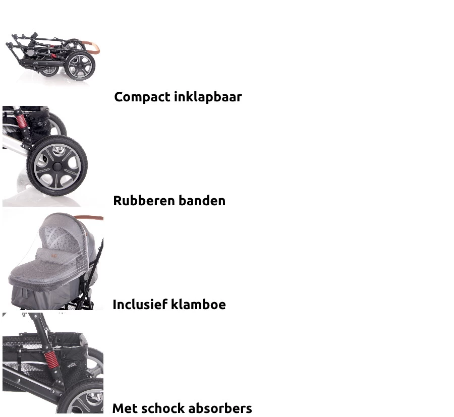 Groep 0 autostoel en adapters, luiertas, beenkap, ruime boodschappenmand, verstelbare zonnekap, dubbelzijdig inlegkussen en klamboe - Maximaal gewicht: